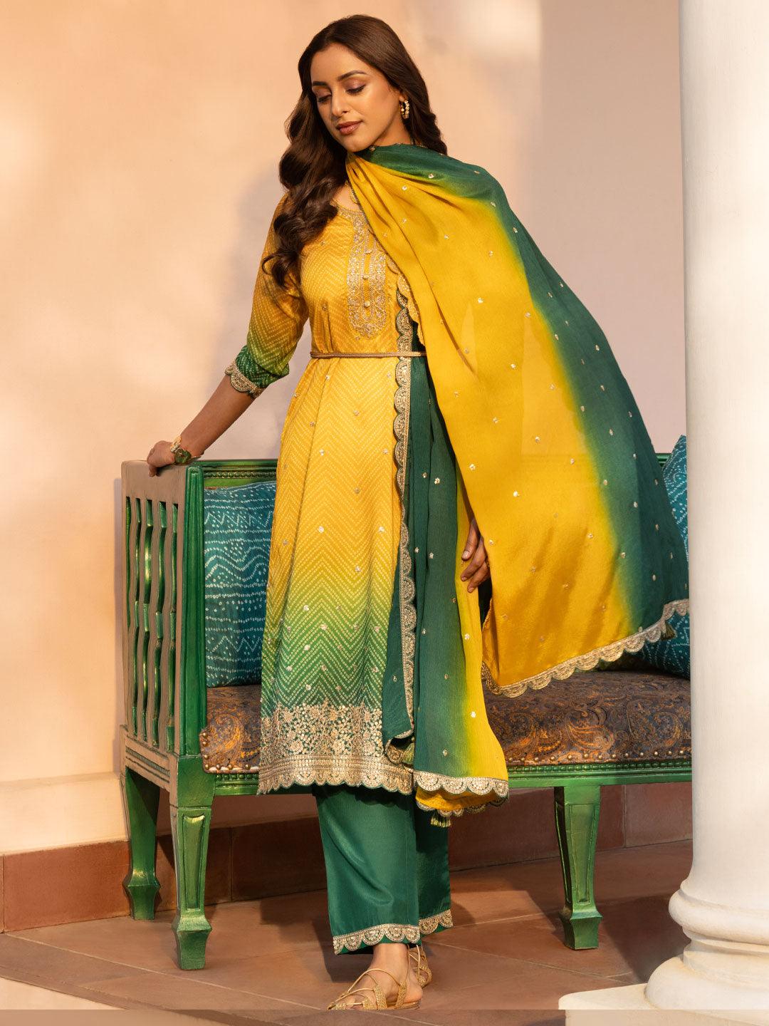 Be the first to review “Mustard Printed Chinon Straight Suit Set”