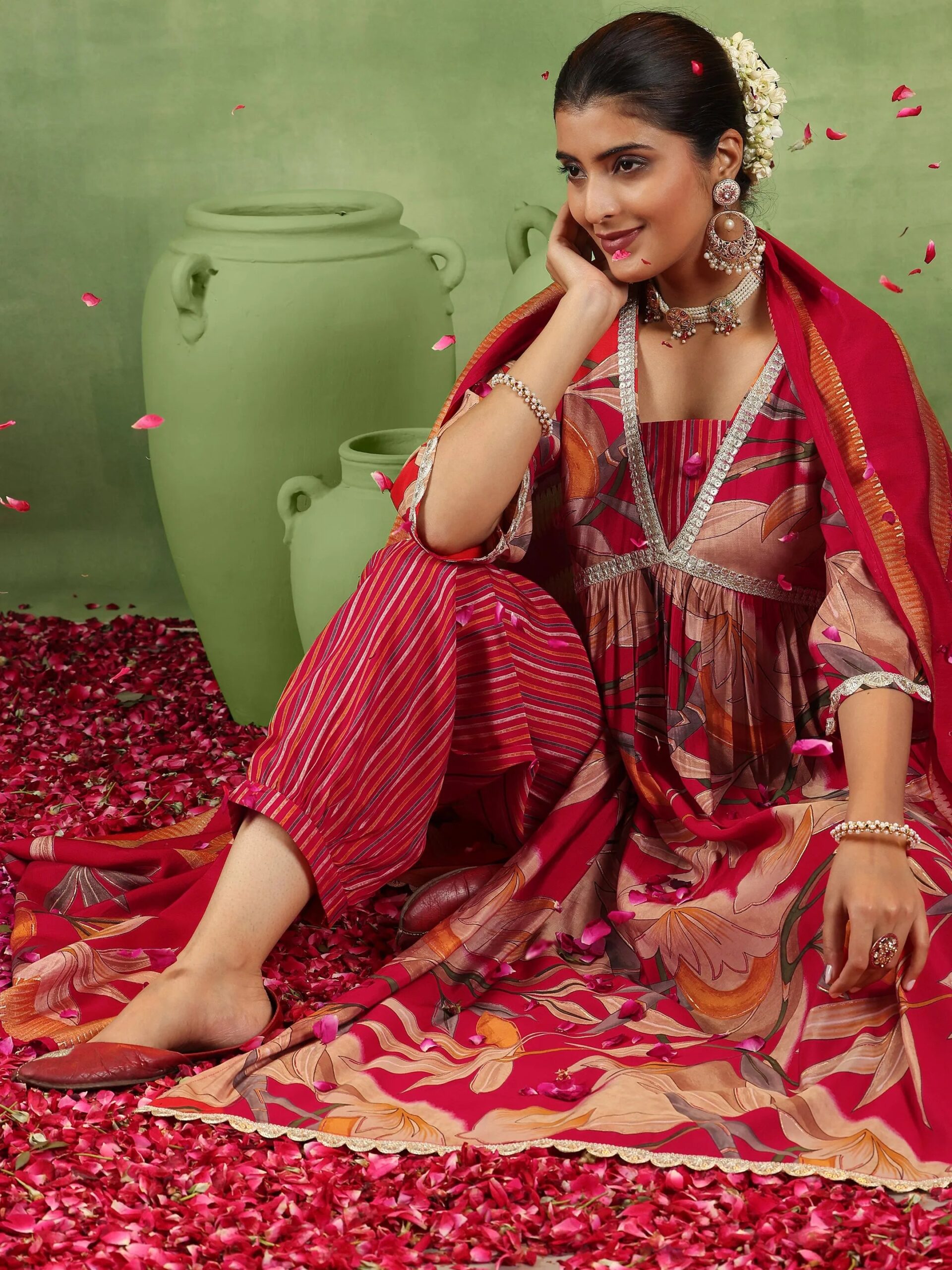 Red Printed Silk Blend A-Line Kurta With Bottom