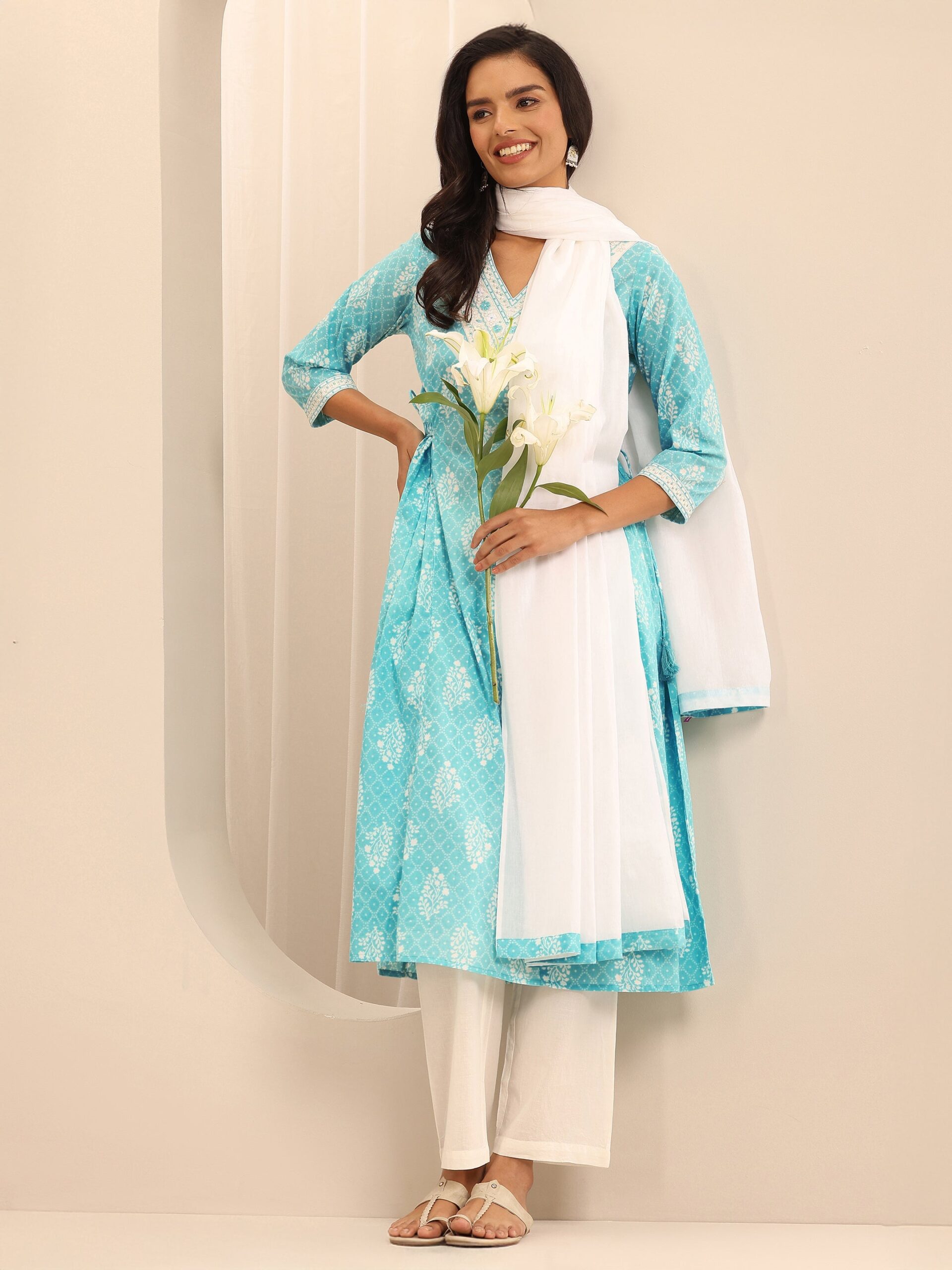 Turquoise Printed Cotton A-line Suit Set